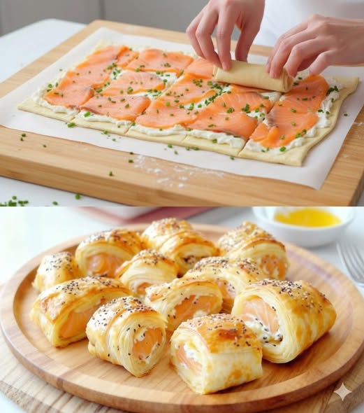 🥐✨ Crujientes, cremosos y listos en 10 minutos: los rollitos de hojaldre con salmón que conquistan a todos.