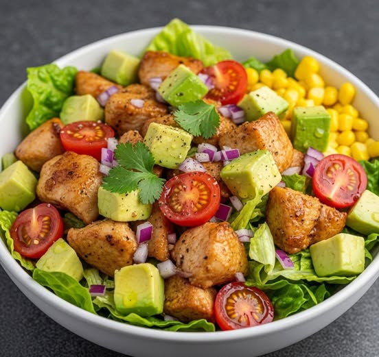 El pollo aporta la prote铆na necesaria para mantener la saciedad y apoyar una alimentaci贸n balanceada, mientras que el aguacate a帽ade una textura cremosa y grasas buenas que benefician la salud cardiovascular. La lechuga fresca funciona como base ligera y refrescante, acompa帽ada por tomates cherry jugosos, granos de ma铆z dulce y cebolla morada, que aportan contraste de sabores y una agradable combinaci贸n de texturas. El cilantro fresco realza el sabor del plato con un toque arom谩tico que lo hace a煤n m谩s apetecible. Esta combinaci贸n no solo es deliciosa, sino tambi茅n rica en vitaminas, minerales y antioxidantes esenciales para el bienestar general.