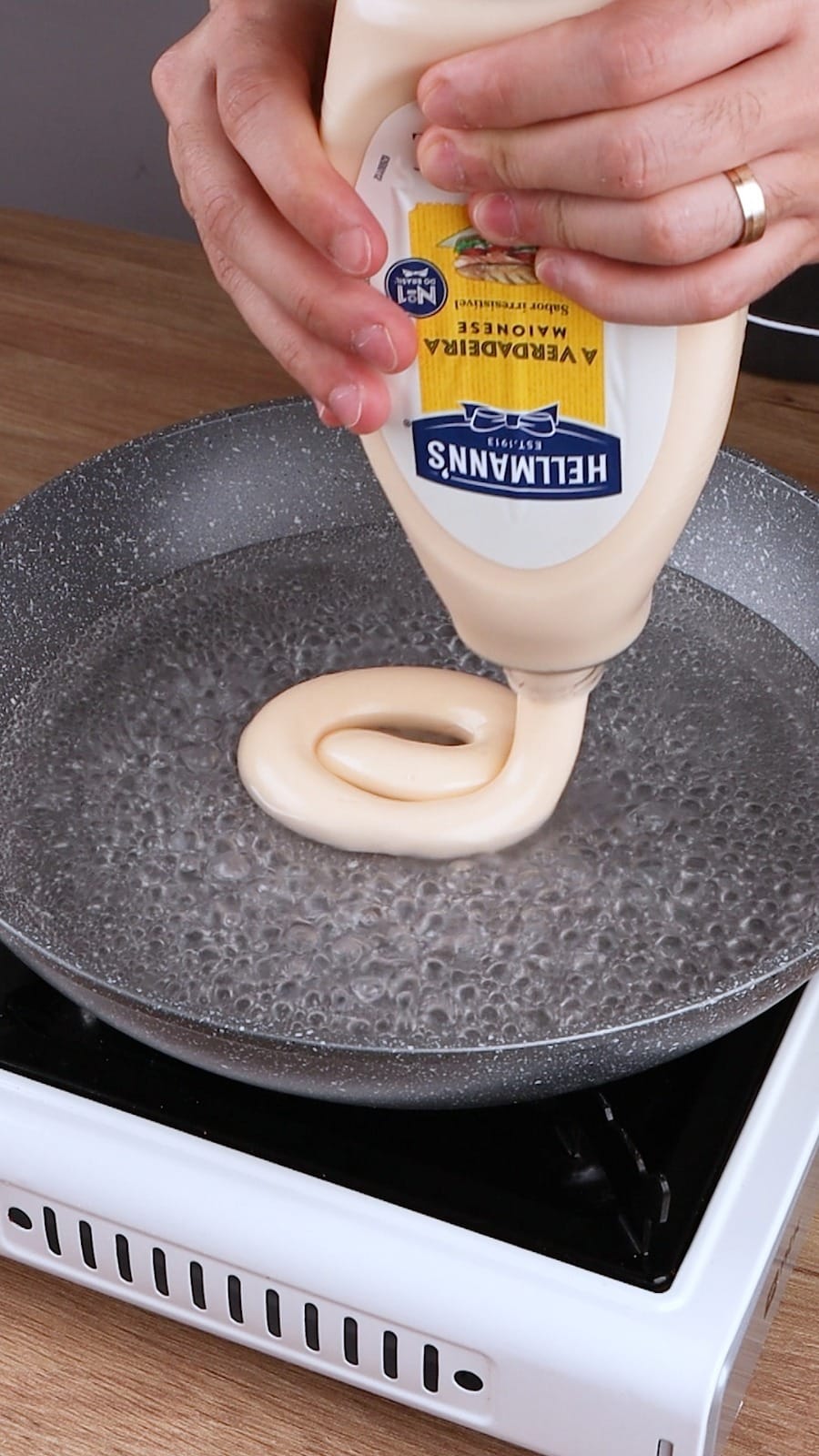 - Boil Water and Add Mayonnaise: Pour 250 ml of water into a skillet. Bring the water to a boil over medium heat. As soon as it bubbles, add 5 tablespoons of mayonnaise and stir until fully dissolved.