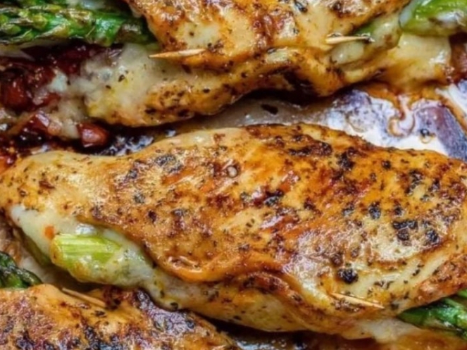 cheesy garlic asparagus stuffed chicken in a lemon butter sauce is the most delicious way to get your veggies in.Believe it or not our Asparagus Stuffed Chicken recipe is loved by the whole family! Why? Garlic smothered asparagus gets stuffed inside juicy chicken breasts with mozzarella cheese baked in lemon butter and is ready in no time at all!asparagus stuffed chicken recipeWith the abundance of fresh asparagus right now this asparagus stuffed chicken recipe comes to you just in time! Seasoned with garlic powder onion powder herbs paprika salt and pepper you will love the flavours coming out of this pan.The best part? You’re only a few ingredients away to make this low carb greatness. If you’re sick of the same old dried out chicken breast recipes add a mouth-watering twist to your weekly menu and stuff them with cheesy asparagus.Ingredients2-4 large skinless boneless chicken breast2-4 slices Swiss or Mozzarella cheeseGarlic powder (to taste)Onion powder (to taste)Paprika (to taste)Italian seasoning (to taste)Salt and black pepper8 asparagus spears trimmed1/4 cup Panko bread crumbs (optional)DirectionsPreheat an oven to 375 degrees. Grease an 8×8-inch baking dish.Place chicken breast between resealable freezer bag on counter top. Firmly pound the chicken with the smooth side of a meat mallet to an even thickness of about 1/4 inch.Sprinkle each side with garlic powder onion powder paprika italian seasoning salt and pepper.Place 4 spears of asparagus down the center of a chicken breast then place cheese on topRepeat with the other chicken breast and roll the chicken around the asparagus and cheese to make a roll. Tie rolls with string or use toothpicks.Place the rolls seam sides down in the prepared baking dish and sprinkle each with about 2 tablespoons of bread crumbs.Bake in the preheated oven until the juices run clear when pricked with a fork about 25 minutes.