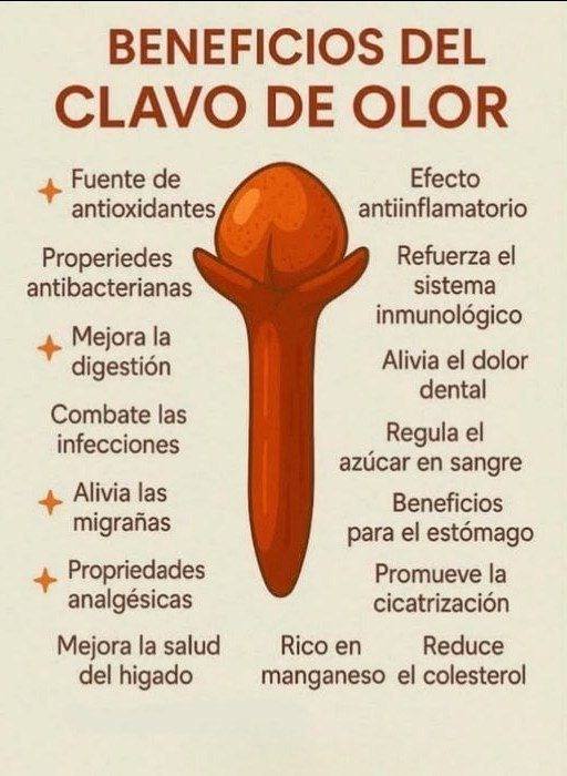El clavo de olor es una especia aromática que no solo agrega sabor a las comidas, sino que también tiene propiedades medicinales impresionantes. Desde la antigüedad, se ha utilizado en la medicina tradicional para aliviar dolores dentales, mejorar la digestión y combatir infecciones. Su principal componente, el eugenol, es un poderoso antioxidante y antiinflamatorio que ayuda a proteger el cuerpo de los radicales libres, reducir inflamaciones y fortalecer el sistema inmunológico. Incorporar clavo de olor en la dieta, ya sea en infusiones, aceites esenciales o como condimento, puede ser una forma natural de cuidar la salud.