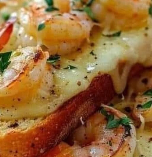 On one half of the garlic bread, layer the cooked shrimp and sprinkle with Monterey Jack cheese.