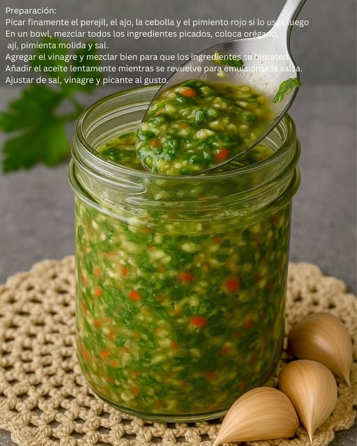 Estos ingredientes combinados crean un balance entre acidez, frescura y un ligero toque picante, ideal para realzar el sabor de las carnes a la parrilla o incluso como aderezo de ensaladas.