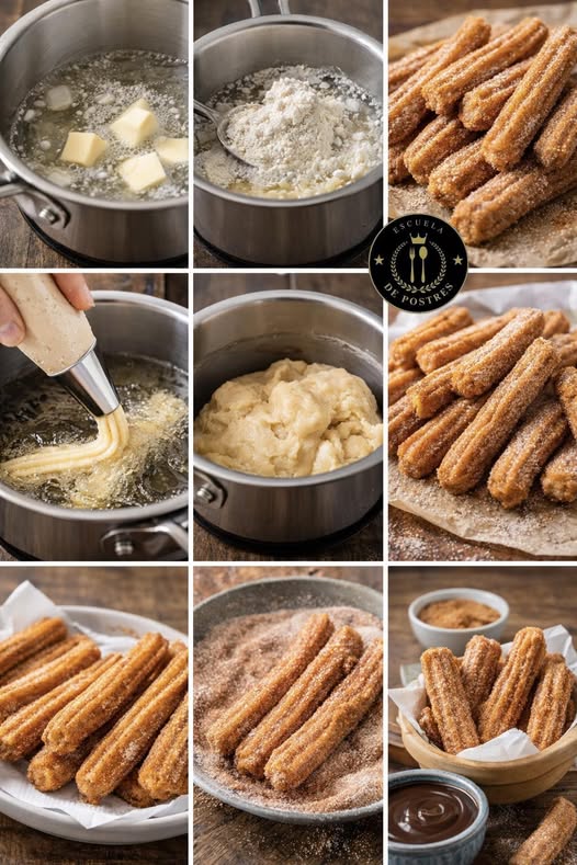 La preparación de los churros requiere solo unos pasos básicos, pero con resultados sorprendentes. Primero, se combina el agua, el azúcar, la mantequilla y la sal hasta que hierva y se obtiene una mezcla homogénea al agregar la harina. Luego, con ayuda de una manga pastelera y una boquilla de estrella grande, se forma la clásica figura del churro. El aceite caliente asegura que los churros queden dorados y crujientes por fuera, mientras que la textura interior se mantiene suave y ligera. Finalmente, al rebozarlos en azúcar mezclada con canela, se logra ese toque dulce y aromático que todos amamos. Cada paso es sencillo, pero al final el resultado parece sacado de una pastelería profesional.