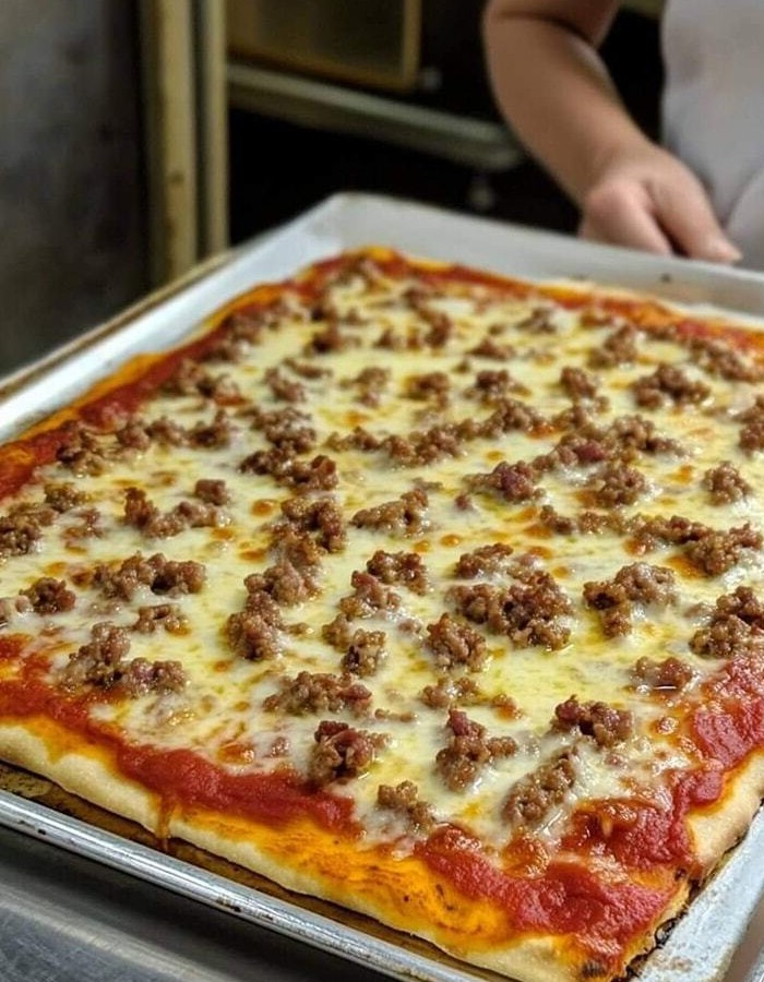 This sheet-pan pizza brings back the beloved cafeteria slice: a quick-rise thick crust, herb-forward sauce, crumbled sausage-beef topping, and plenty of melty mozzarella.
