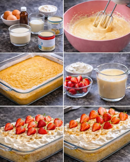 La cobertura y decoración terminan de convertir este pastel en un postre irresistible. La crema batida aporta suavidad y frescura, equilibrando la dulzura del relleno sin resultar pesada. Además, permite una presentación elegante y sencilla, perfecta tanto para ocasiones especiales como para ventas caseras o emprendimientos de repostería. Las fresas frescas no solo añaden color y atractivo visual, sino también un contraste ligeramente ácido que realza el sabor del conjunto. Gracias a su versatilidad, el pastel tres leches se adapta fácilmente a diferentes gustos, pudiendo decorarse con frutas, coco o chocolate. En un contexto donde los postres caseros ganan cada vez más popularidad, esta receta se mantiene como una de las más buscadas por su éxito garantizado. Prepararlo en casa es apostar por un clásico que nunca falla y que siempre deja a todos con ganas de repeti
