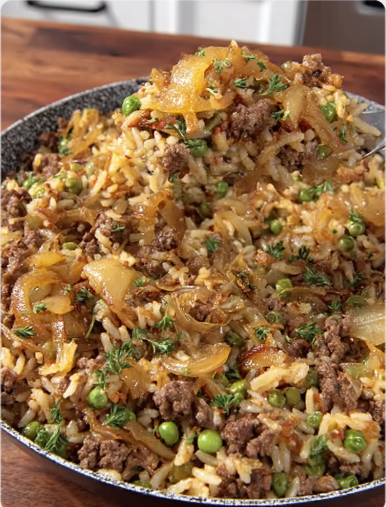 Once the rice is tender and the flavors have melded together, serve the French Onion Ground Beef & Rice One-Skillet Meal hot, garnished with fresh herbs if desired.