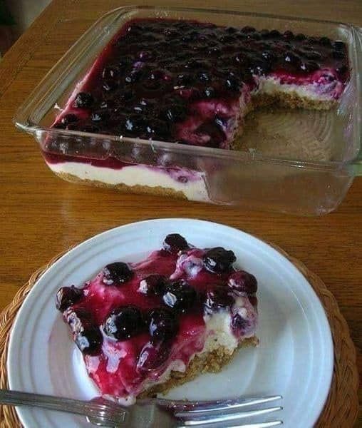 Pour the cream cheese mixture over the crust in the pan. Drop spoonfuls of the blueberry mixture over the top of the cream cheese mixture. Use a knife to swirl the blueberry mixture into the cream cheese mixture.
