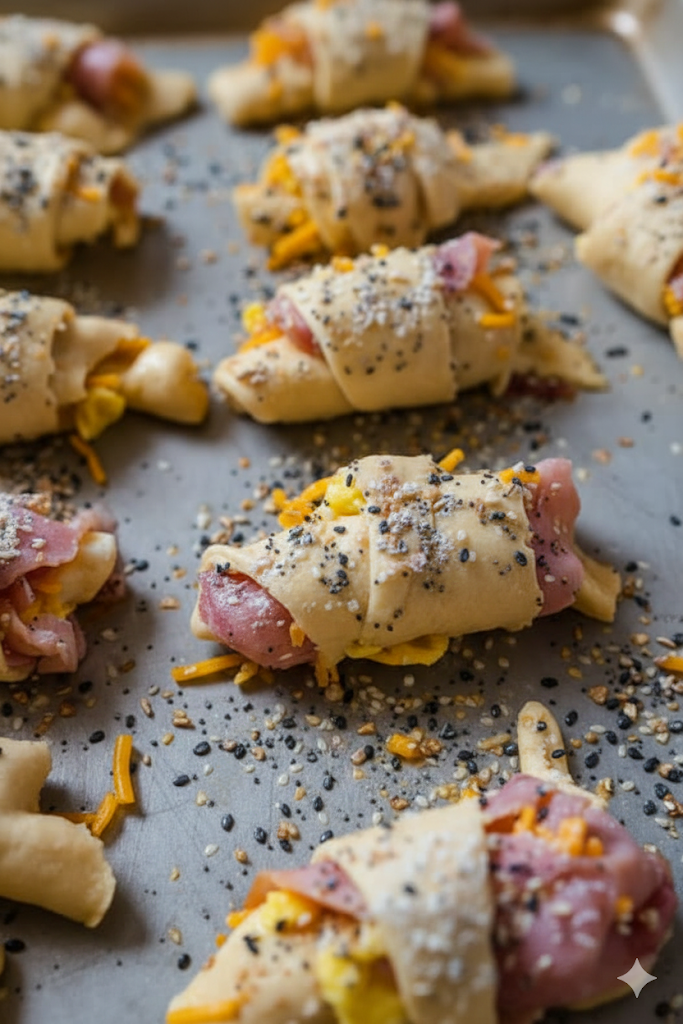 These Grab-and-Go Breakfast Rolls are the ultimate morning comfort food—flaky crescent rolls wrapped around fluffy scrambled eggs, savory ham, melty cheddar, and a sprinkle of green onion. Finished with a touch of everything bagel seasoning, they’re portable, satisfying, and irresistibly good.
