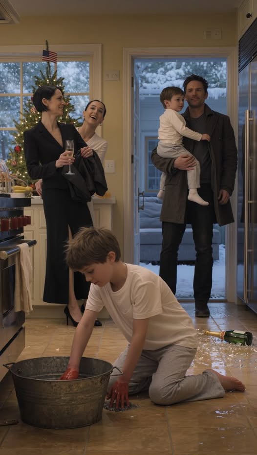 Cuando entré en la casa, todo parecía un escenario de revista: luces cálidas, un árbol enorme y los niños abriendo regalos con emoción. Pero algo llamó inmediatamente mi atención. Desde la ventana de la sala, vi a Todd de rodillas en la cocina, fregando el piso en ropa interior, con los hombros temblando por el esfuerzo y el frío. Christa lo observaba sonriendo, y Ashley parecía encontrar divertido aquel momento.