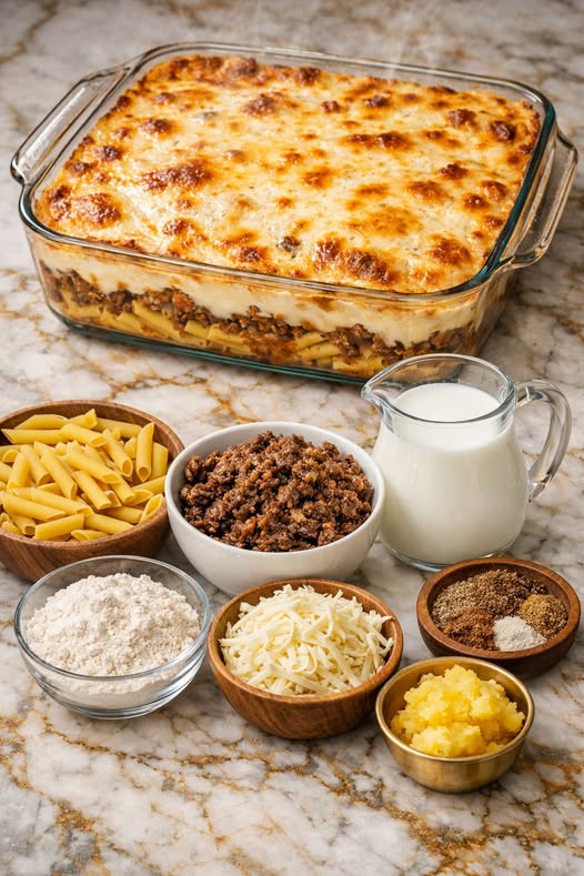Además de ser delicioso, este plato es muy práctico y versátil. Se puede preparar por etapas: cocer la pasta, cocinar la carne con los condimentos, y finalmente montar la bechamel sobre la pasta y la carne, cubriéndolo todo con la mezcla de quesos. Esto permite que se conserve bien en el refrigerador y pueda recalentarse al día siguiente sin perder cremosidad ni sabor. Es perfecto para almuerzos familiares, cenas o reuniones con amigos, y admite variaciones según los gustos: se pueden añadir más especias, distintos tipos de queso o incluso verduras para adaptarlo a una alimentación más equilibrada. Este plato demuestra que la cocina tradicional puede combinarse con soluciones modernas para crear recetas prácticas, nutritivas y siempre deliciosas. 🍖🧀🍝