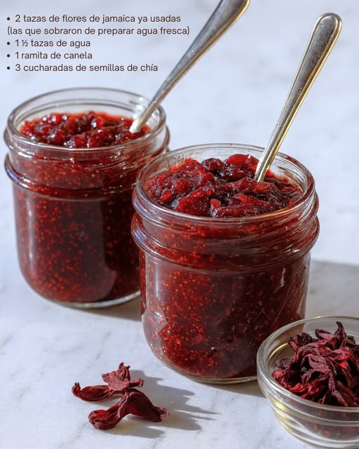 La mermelada de jamaica con chía es un ejemplo perfecto de cómo transformar ingredientes simples en un producto delicioso, saludable y versátil. Aprovechando las flores de jamaica que ya se han utilizado para preparar agua fresca, esta receta no solo evita desperdicios, sino que también potencia los beneficios de esta planta rica en antioxidantes y vitamina C. La combinación con semillas de chía aporta fibra, ácidos grasos omega-3 y una textura característica que hace que la mermelada sea más consistente y agradable al paladar. Este tipo de preparación se ha vuelto muy popular entre quienes buscan alternativas naturales y nutritivas para sus desayunos, postres o meriendas, sin necesidad de conservadores artificiales.