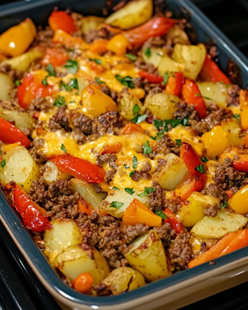 This hearty Oven Baked Southwestern Beef and Pepper Bake is a flavorful and satisfying one-pan meal. It combines seasoned ground beef, tender potatoes, and a colorful mix of bell peppers in a rich, savory sauce, all topped with melted cheddar cheese. It’s a simple, comforting dish that is perfect for a weeknight dinner.