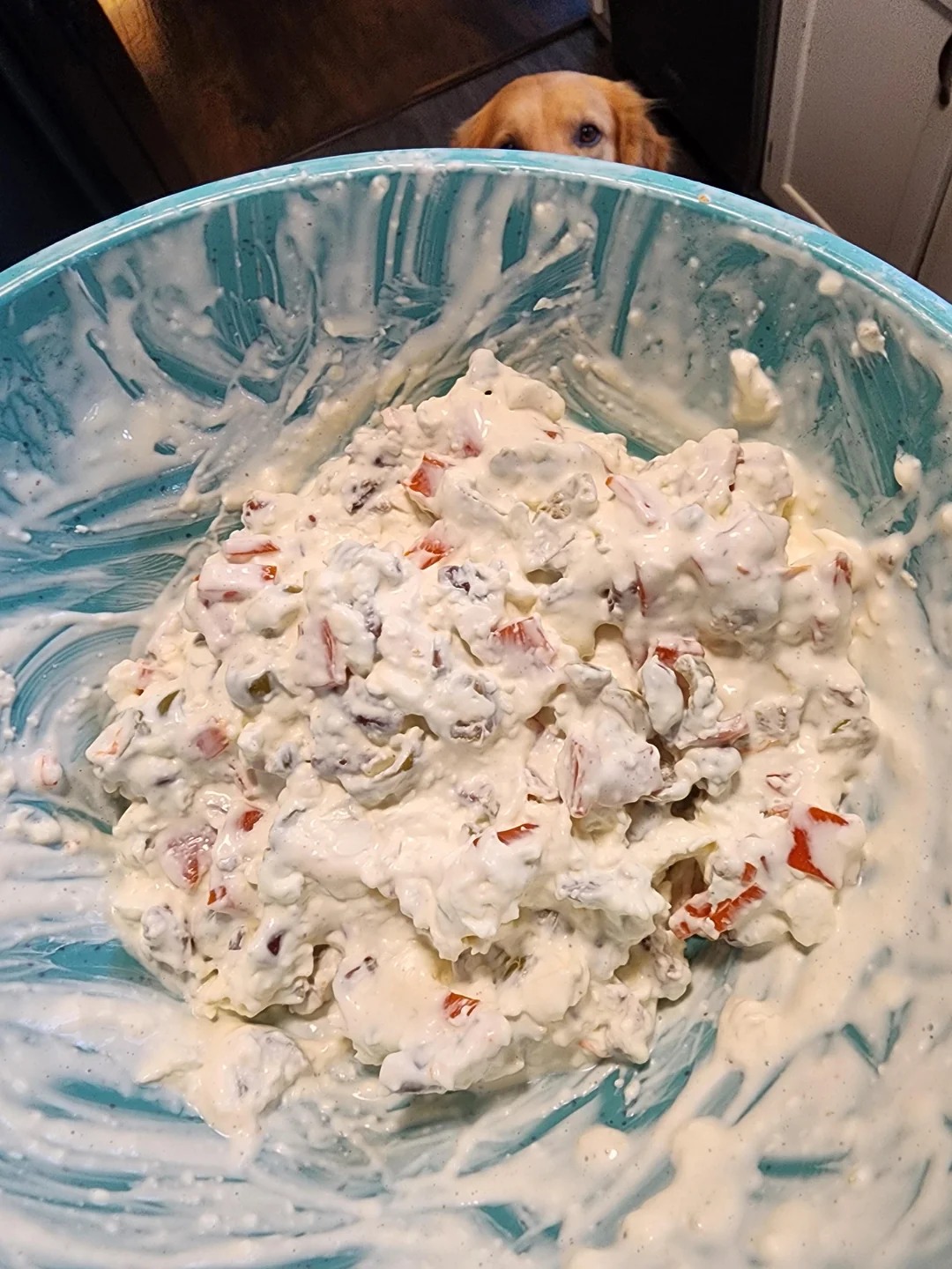 - In a mixing bowl, combine the softened cream cheese, 1/2 cup of mayonnaise, chopped pecans, chopped salad olives, and 2 tablespoons of olive juice.