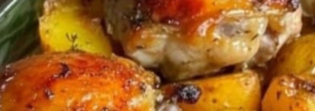 Ingredients:6 chicken thighs (bone-in, skin-on)800g (1.75 lbs) baby potatoes, halved or quartered3 tablespoons olive oil4 garlic cloves, minced1 tablespoon fresh rosemary (or 1 tsp dried)1 teaspoon thyme1 teaspoon paprikaSalt and pepper, to tasteJuice of 1 lemon (optional for extra flavor)Instructions:Preheat oven to 200°C (400°F).In a large bowl, mix olive oil, garlic, rosemary, thyme, paprika, salt, and pepper.Add the chicken thighs and potatoes to the bowl. Toss well until everything is evenly coated with the marinade.Arrange the chicken thighs and potatoes in a baking dish or roasting pan in a single layer.Optionally, squeeze fresh lemon juice over the top for extra flavor.Bake in the oven for 45–55 minutes, or until the chicken is fully cooked (internal temp 75°C/165°F) and the skin is golden brown. Potatoes should be tender and slightly crispy.Serve hot with a side salad or steamed vegetables.Tip: You can broil for the last 3–5 minutes to crisp the skin more.Enjoy!
