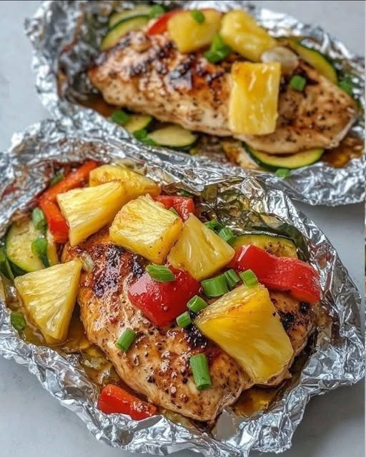 Si quieres una comida sabrosa, ligera y rápida, estos paquetes de pollo teriyaki con piña son una opción ideal. Puedes preparar varios paquetes con anticipación y guardarlos en el refrigerador; luego solo los recalientas y listo. Perfecto para quienes buscamos recetas saludables sin sacrificar sabor.