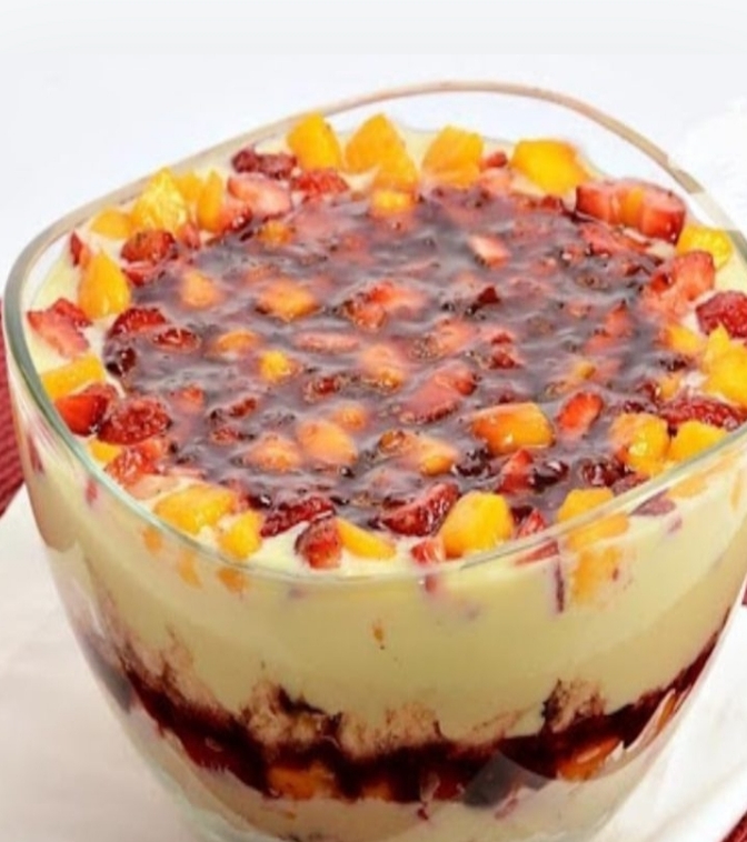 INGREDIENTSFor the Sponge Cake:4 large eggs, separated1 cup granulated sugar1 cup all-purpose flour1 teaspoon baking powder1/4 cup milk1 teaspoon vanilla extractPinch of saltFor the Custard:2 cups whole milk1/2 cup granulated sugar4 large egg yolks3 tablespoons cornstarch1 teaspoon vanilla extract2 tablespoons unsalted butterFor the Fruit Layers:2 cups strawberries, hulled and sliced2 kiwis, peeled and sliced1 cup blueberries1 mango, peeled and sliced1/4 cup orange juice (for brushing the cake layers)For Garnish:Whipped creamFresh mint leavesINSTRUCTIONS:Preheat the Oven:Preheat your oven to 350°F (175°C). Grease and line a rectangular baking pan (approximately 9×13 inches) with parchment paper.Prepare the Batter:In a large mixing bowl, beat the egg whites with a pinch of salt until soft peaks form. Gradually add half of the sugar, beating until stiff peaks form.In a separate bowl, beat the egg yolks with the remaining sugar until pale and fluffy. Add the vanilla extract.Gently fold the beaten egg whites into the egg yolk mixture.Sift together the flour and baking powder, then gently fold into the egg mixture, alternating with the milk until just combined.Bake the Cake:Pour the batter into the prepared baking pan, spreading it evenly.Bake for 20-25 minutes, or until a toothpick inserted into the center comes out clean.Allow the cake to cool completely in the pan before cutting it into two equal layers.Make the Custard:In a medium saucepan, heat the milk over medium heat until it begins to simmer.In a bowl, whisk together the egg yolks, sugar, and cornstarch until smooth.Gradually pour the hot milk into the egg mixture, whisking constantly to prevent curdling.Return the mixture to the saucepan and cook over medium heat, stirring constantly, until the custard thickens and coats the back of a spoon.Remove from heat and stir in the vanilla extract and butter. Allow the custard to cool slightly before using.Prepare the Fruit:Slice the strawberries, kiwis, mango, and any other desired fruits. Set aside a few slices for garnish.Layer the Pavé:Place one layer of the sponge cake in the bottom of a rectangular serving dish or a trifle dish.Brush the cake layer with orange juice to moisten it.Spread a generous layer of custard over the cake, followed by a layer of mixed fruit slices.Repeat the layers with the second sponge cake layer, brushing with orange juice, spreading custard, and topping with fruits.Final Touches:Garnish the top layer with the reserved fruit slices, arranging them in an attractive pattern.Chill the assembled pavé in the refrigerator for at least 2 hours, or overnight, to allow the flavors to meld.Garnish and Serve:Before serving, add a dollop of whipped cream and fresh mint leaves on top for an extra touch of elegance.Slice the pavé into squares and serve chilled.Fresh Ingredients: Use the freshest fruits available to ensure vibrant flavors and a beautiful presentation.Custard Consistency: Ensure the custard is thick enough to hold its shape between the layers. If it seems too thin, cook it a bit longer to thicken.Chill Time: Allowing the pavé to chill for several hours or overnight enhances the flavor and texture, making it easier to slice.