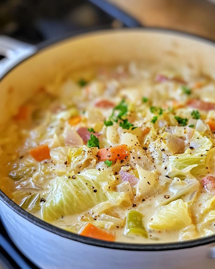 This Southern-Style Creamy Cabbage Soup is a comforting and surprisingly rich dish. The simple flavors of tender cabbage, onion, and garlic are simmered in a savory broth, then finished with heavy cream and a hint of smoked paprika for a wonderfully smooth, warm, and satisfying meal.